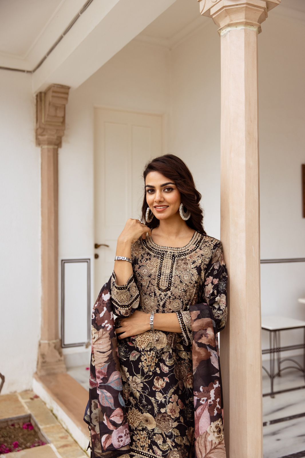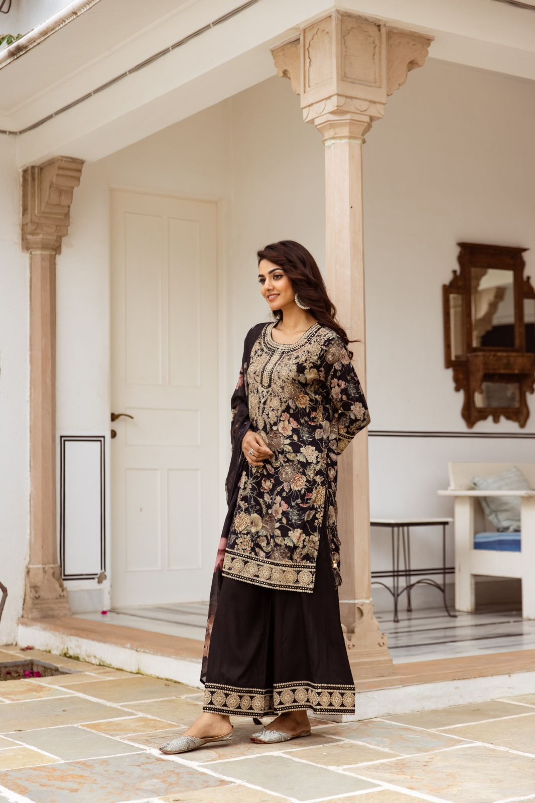 • Design: Features a modern palazzo cut with subtle embellishments, exuding a refined charm.