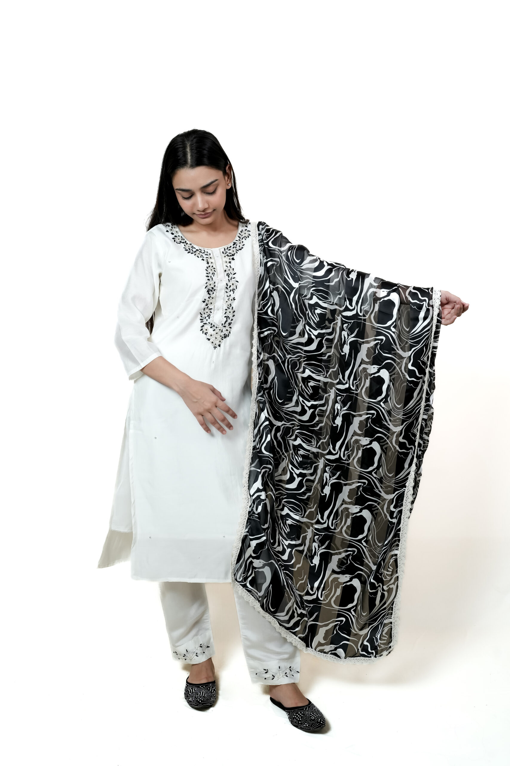 Versatile Contrast: Ideal for a range of occasions, the white suit with a black dupatta exudes versatile charm, offering a timeless and sophisticated look.