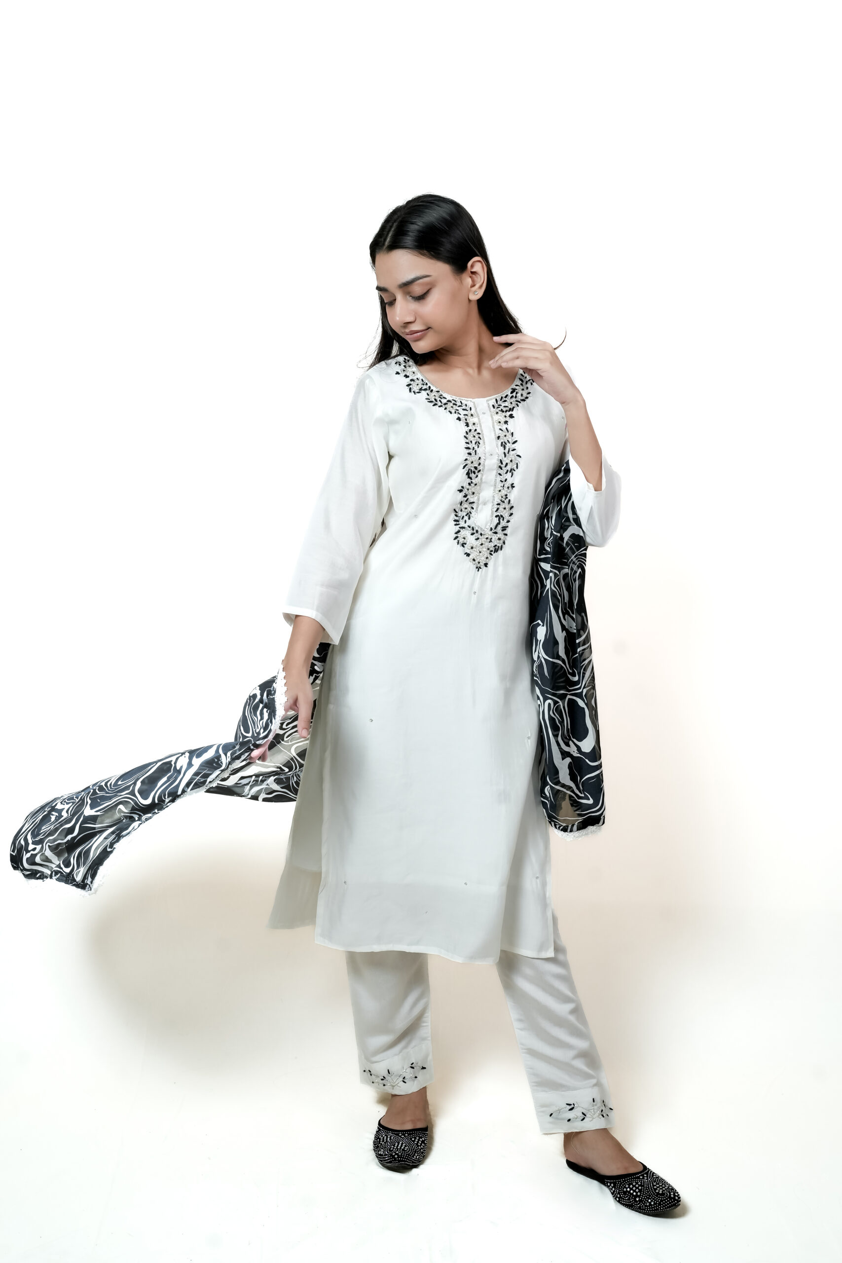 Care Instructions: Preserve the crisp white color and the boldness of the black dupatta by following care instructions, ensuring your White Suit with Black Dupatta remains a symbol of refined style over time.